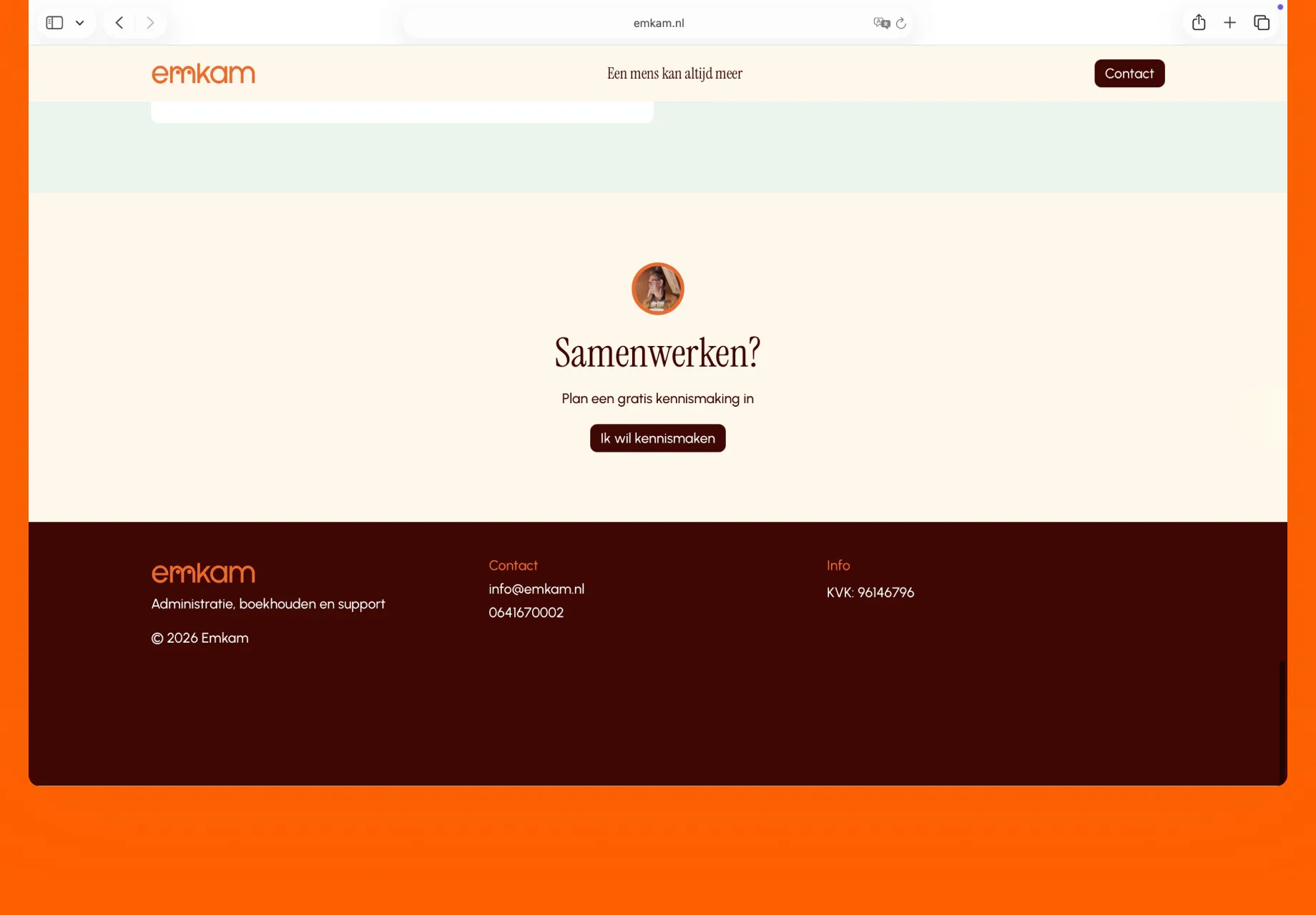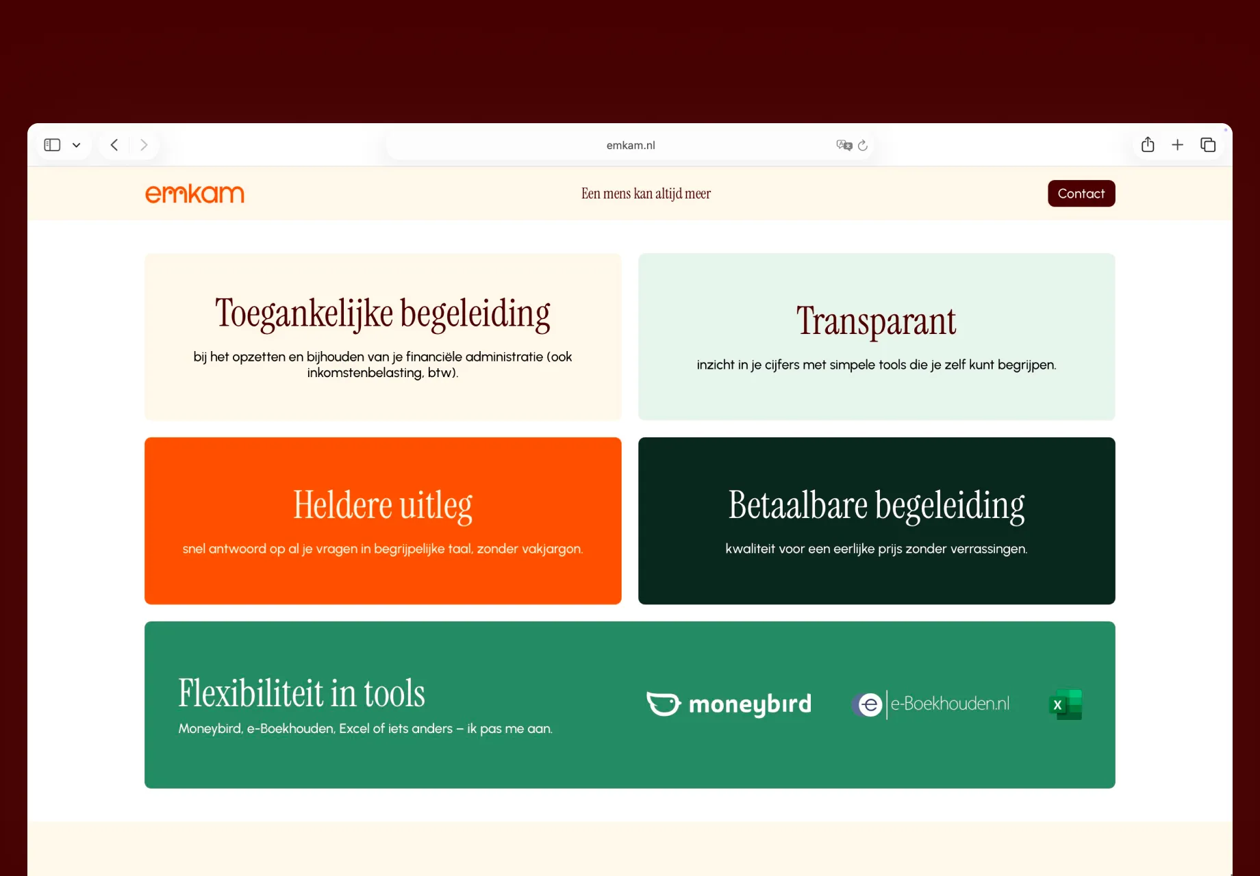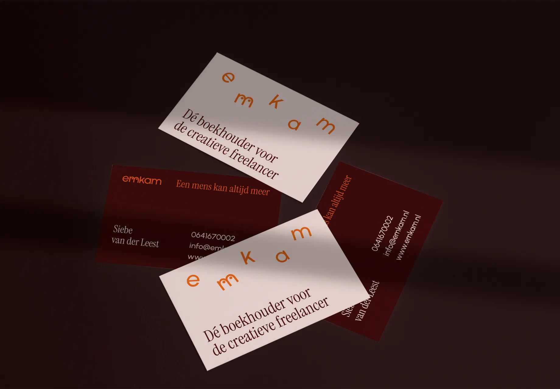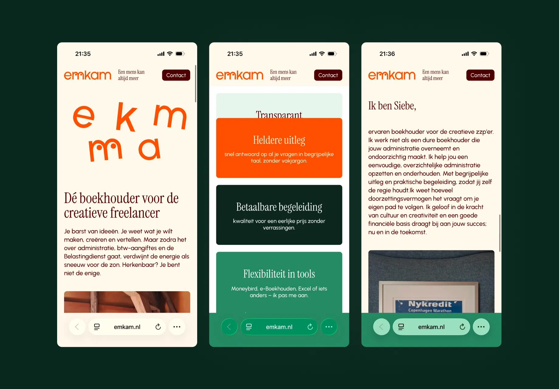 Siebe van Emkam helpt creatieve freelancers met hun boekhouding en benaderde Merkbaar voor een nieuwe identiteit en website. We ontwikkelden een persoonlijke identiteit die rust uitstraalt zonder afstand te creëren. Helder, toegankelijk en professioneel.