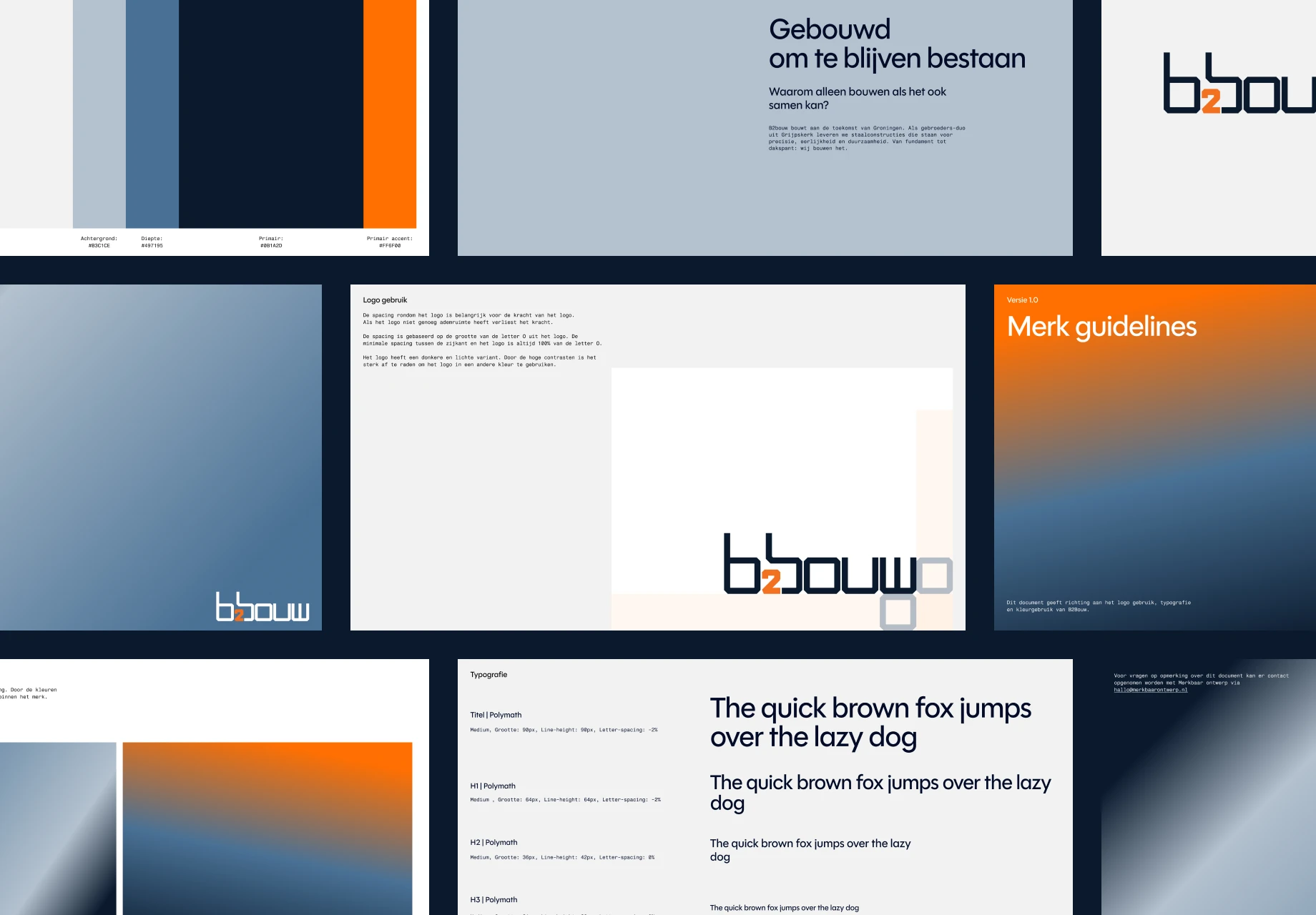 De broers van B2Bouw benaderde Merkbaar met een duidelijke vraag: een logo dat verbinding, samenwerking en kracht uitstraalt. Na een uitgebreid experimenteerproces is een eigen lettertype ontwikkeld dat naadloos aansluit op deze merkwaarden. De vormentaal is geïnspireerd op het verloop van staal tijdens de bewerking, van ruw materiaal tot gevormd eindproduct.